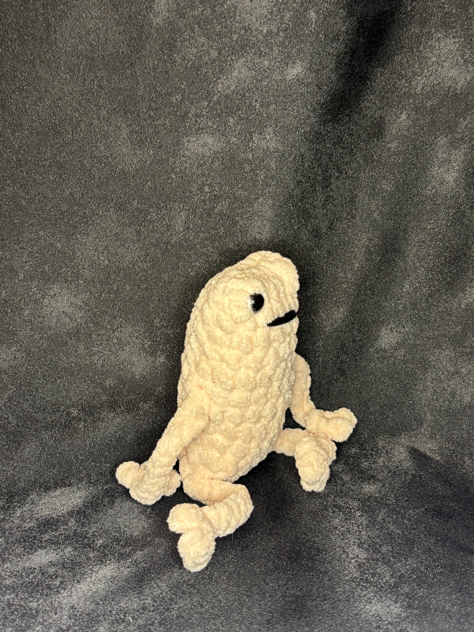 This Leggy Frog plushie is the cutest one you will ever see! These plushies are 3 inches long( from front of head to back of head), and 11 inches wide( from arm to arm) and 10 tall(from top of head to bottom of the feet) and this plushie is looking for a forever home.