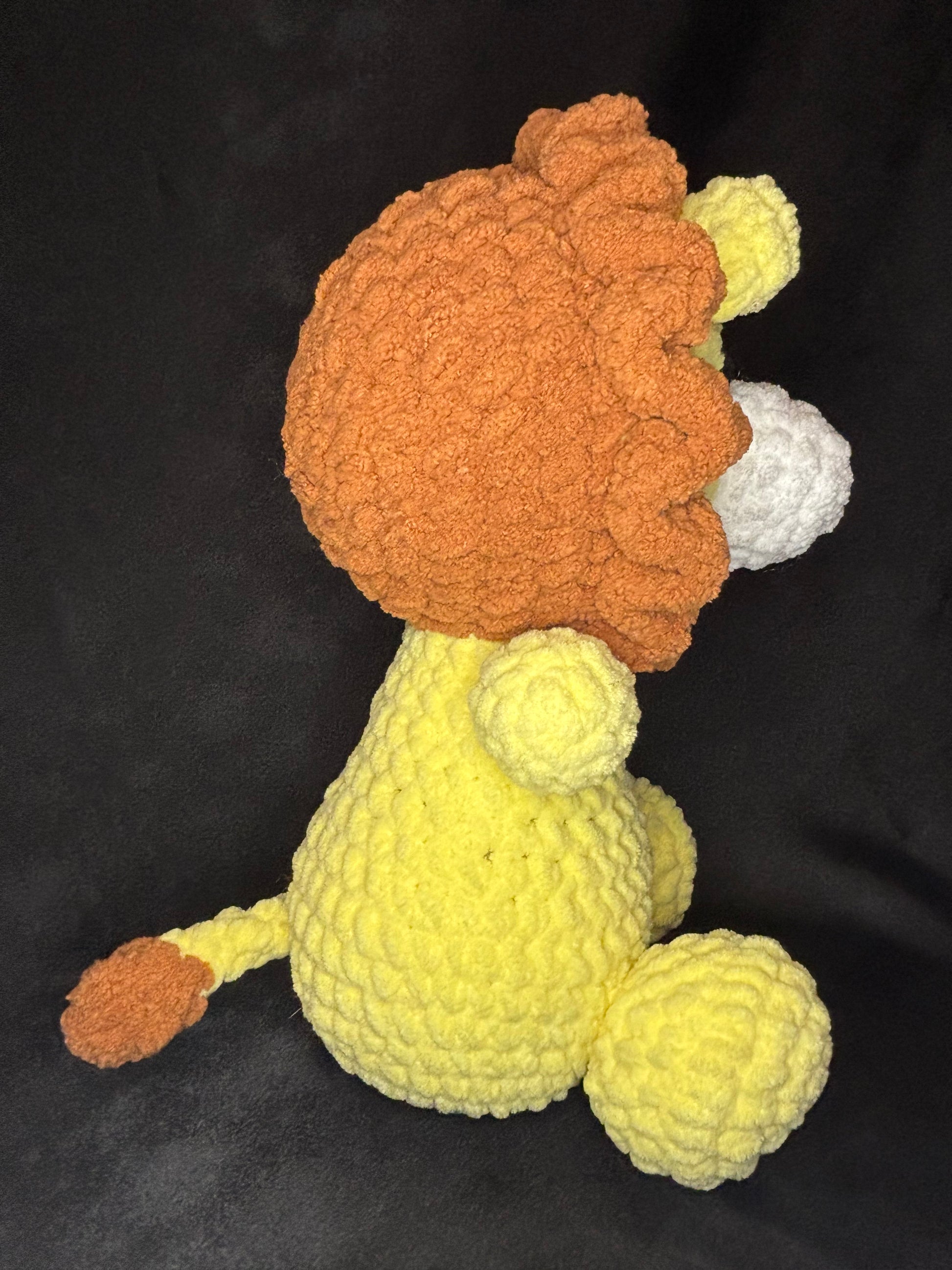 This Lion plushie is the cutest one you will ever see! These plushies are 10.5 inches long( from nose to end of tail), and 8.5 inches wide( from foot to foot) and 13.5 tall(from top of head to bottom of the body) and this plushie is looking for a forever home.